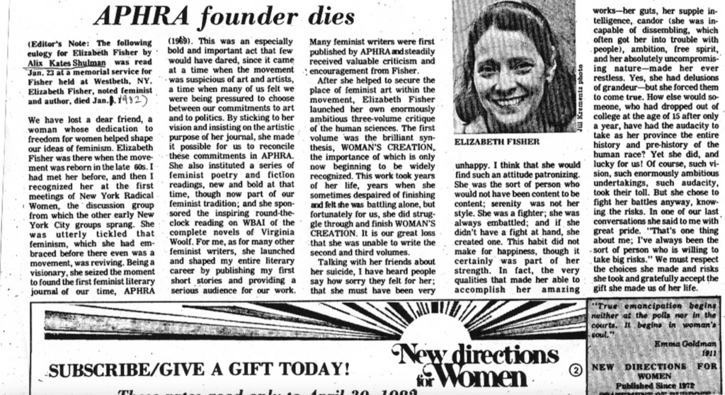 Here is a photograph of the eulogy Alix Kates Shulman wrote and delivered at Fisher’s memorial service. The eulogy was published in New Directions for Women. I could not find the eulogy online. This is a photograph of Shulman’s copy.